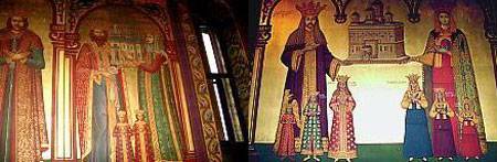 Cununi bogate, lucrate în aur și bătute cu pietre prețioase împodobesc capetele ctitorilor principali. Vesmântul Domnului este de modă bizantină, de stofă înflorată garnisit cu un guler lat, cu o bandă de aceeași lățime pe poale. Spre poalele vesmântului se observă vulturul bizantin brodat în aur, cu pliscul deschis, cu aripile întinse și purtând cunună.