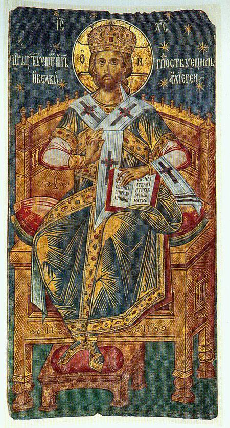Iisus Hristos - împăratul împăraților, Domnul domnilor și Marele Arhiereu este înfățișat așezat pe o pernă cu alesături naționale în scaun adânc, cu spătar înalt; împodobit cu colonete. Iisus tronează binecuvântând cu dreapta și ținând cu stânga pe genunchi o carte deschisă.